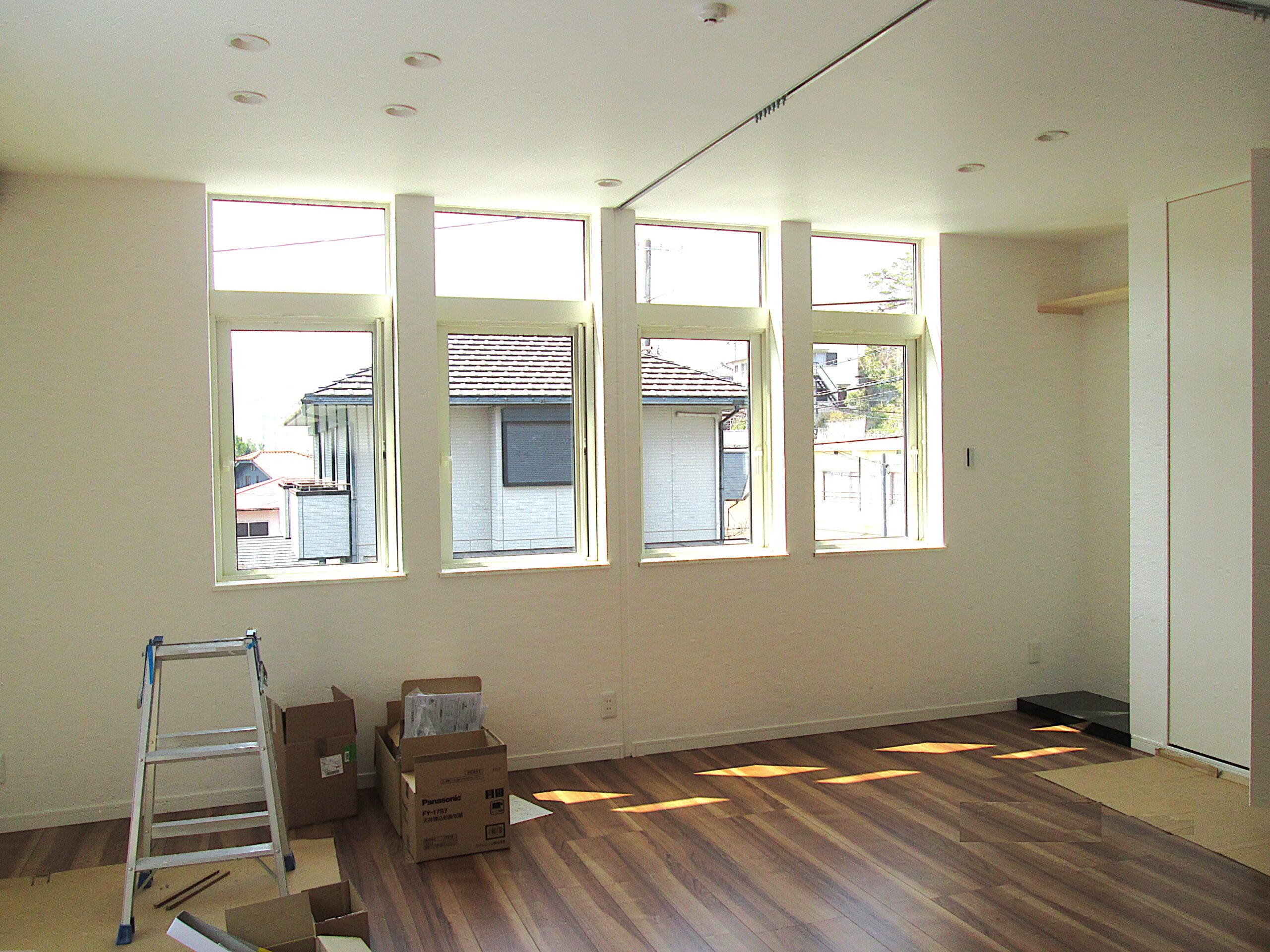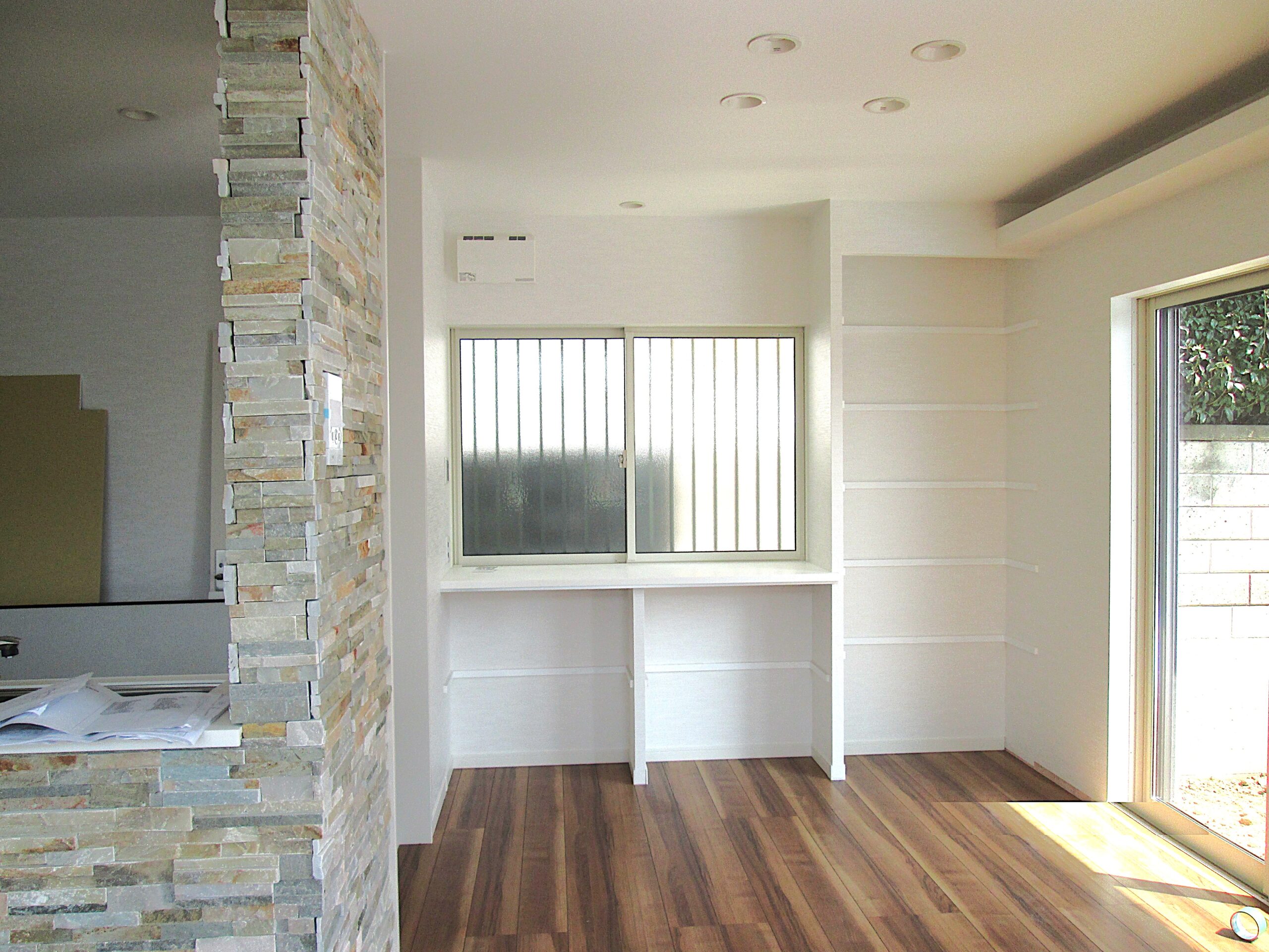 宅地が1m40cm高い為、通行人が気にならず、プライベートの空間が保て、近隣の眺望が良い立地条件だったので、外部環境を生かした室内と庭の一体空間利用の提案をさせていただきました。リビングの先には大きなウッドデッキを施工し “小さなお子様が楽しめて、元気に動き回れる広い空間” “光と風が抜けて、開放感がある空間” “家族のコミュニケーションが広がる空間” 家族の夢を育む家づくりをコンセプトにした素敵な家に仕上りました。